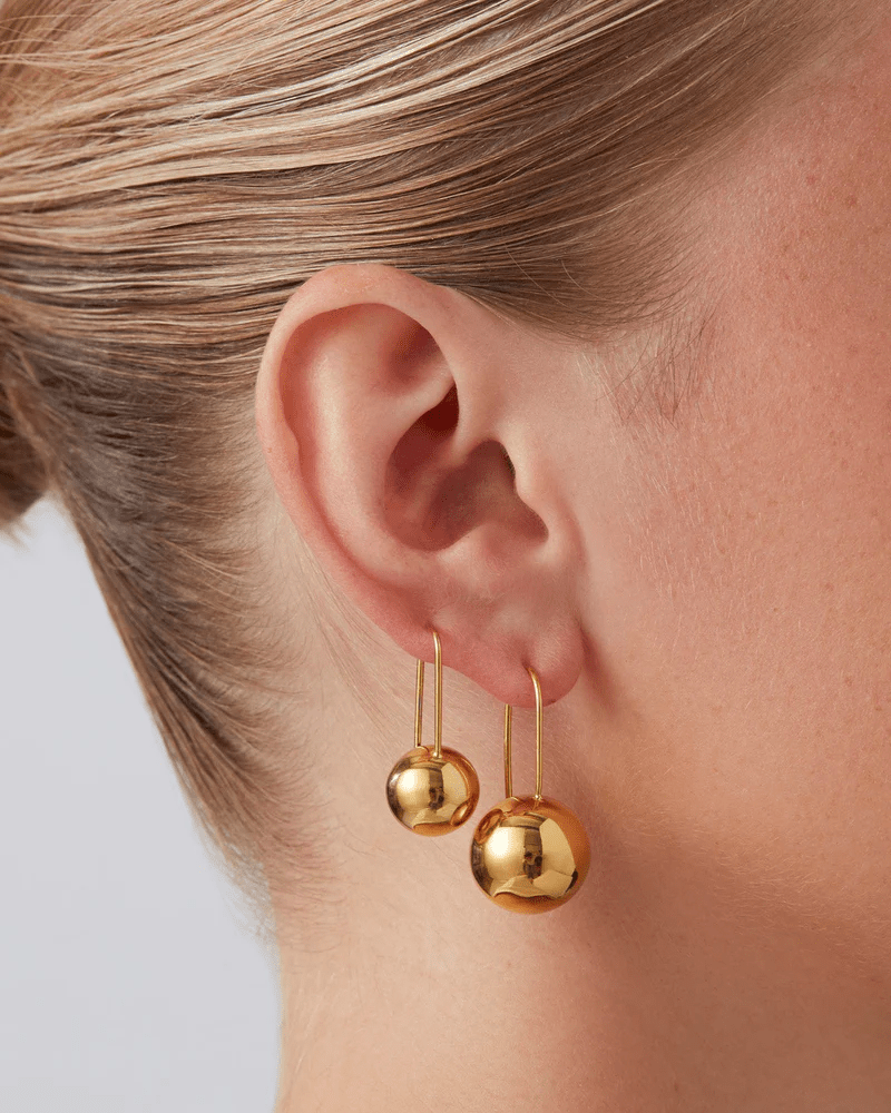 Large and luminous, these metal spheres make for a modern and lightweight take on a drop earring. Finished in high-polish gold.