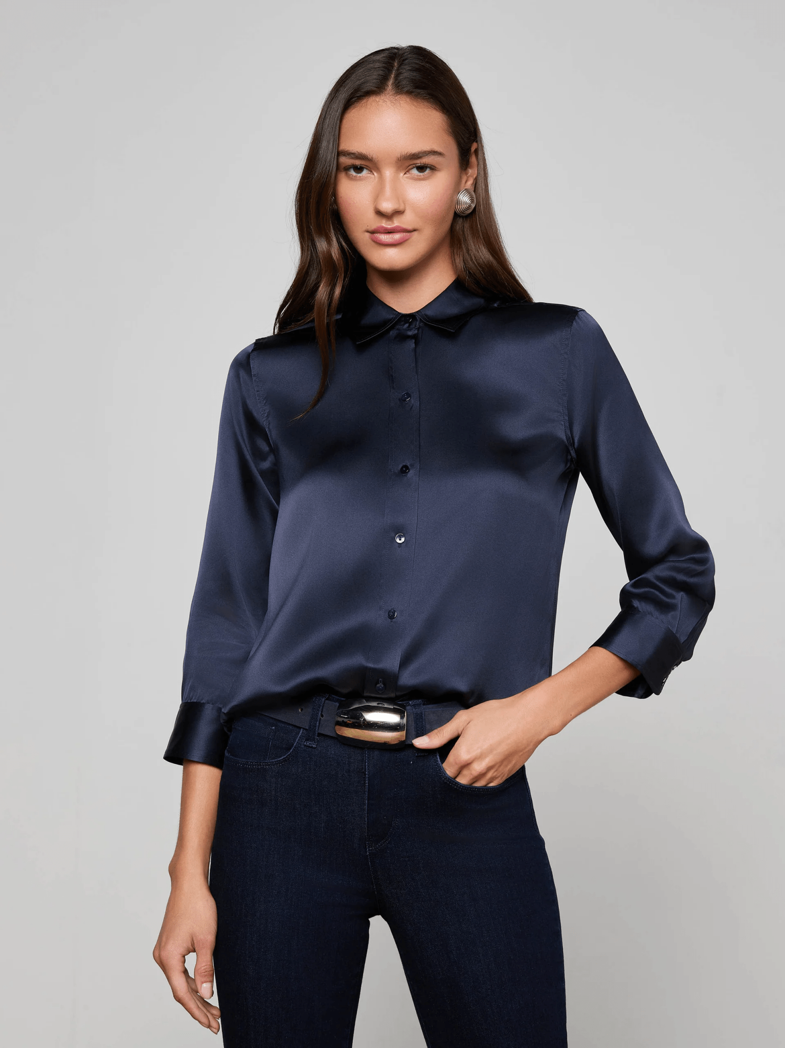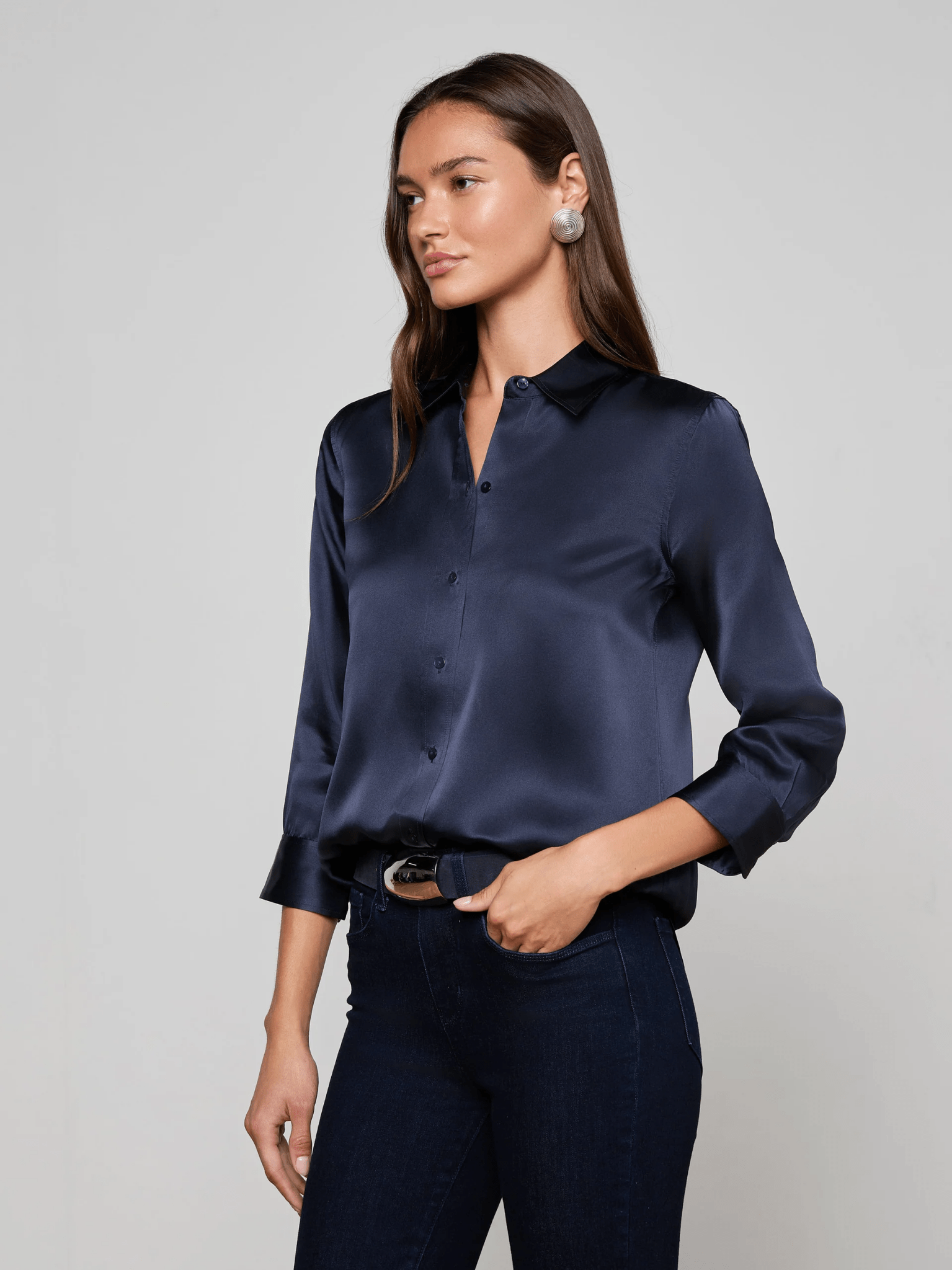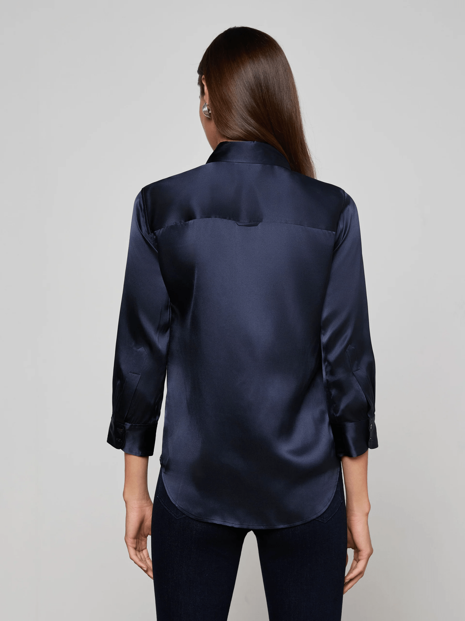 A timeless button-down blouse in lustrous silk charmeuse midnight blue. Featuring a high-low shirttail hem, the fresh design also has a spread collar, three-quarter cuffed sleeve, and back yoke that offer a tailored touch to this feminine look. 100% Silk.