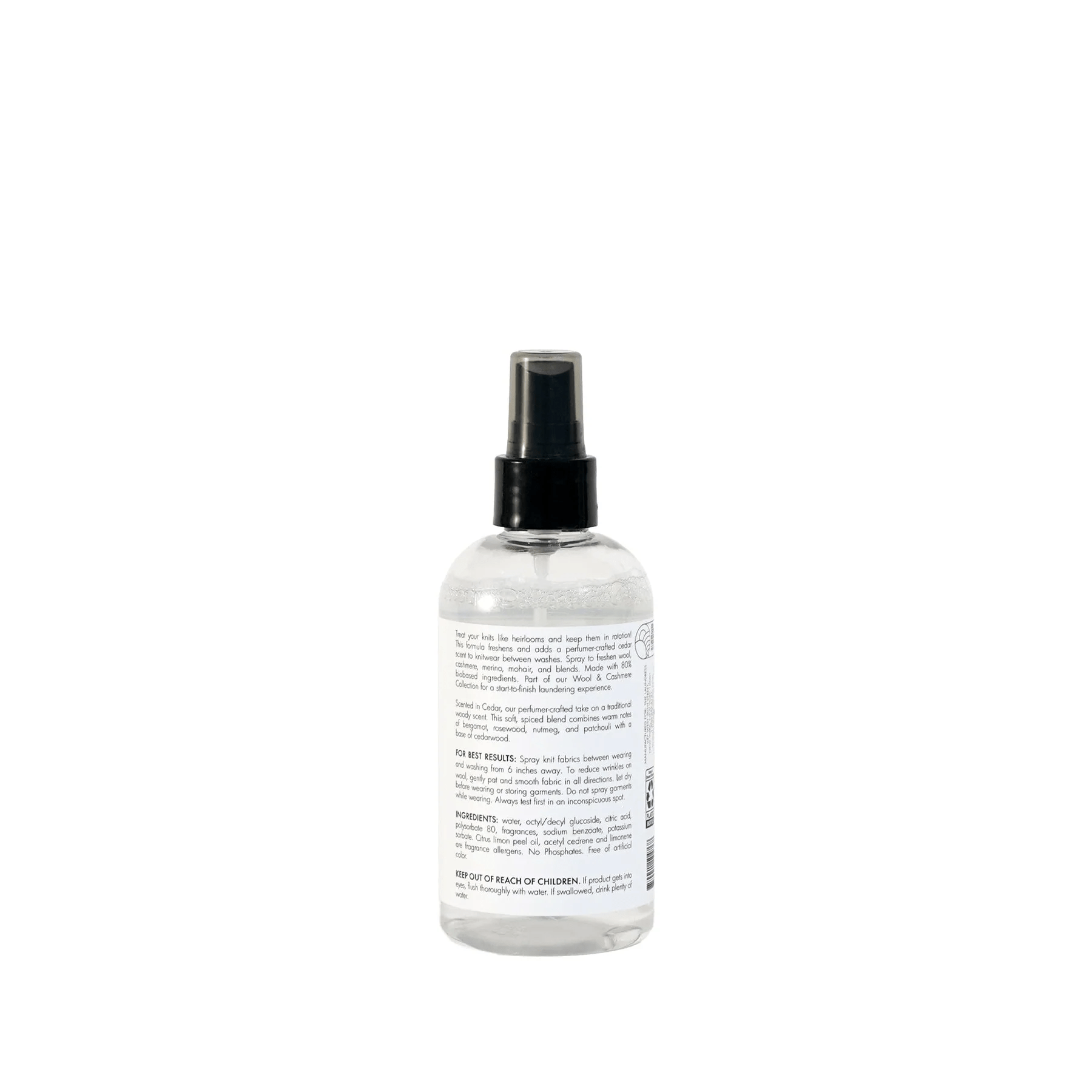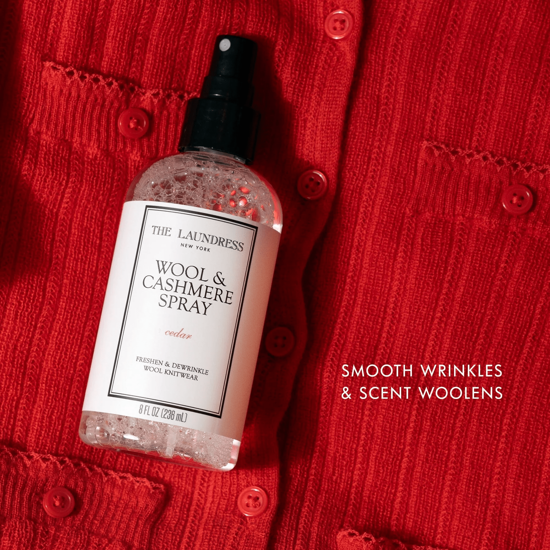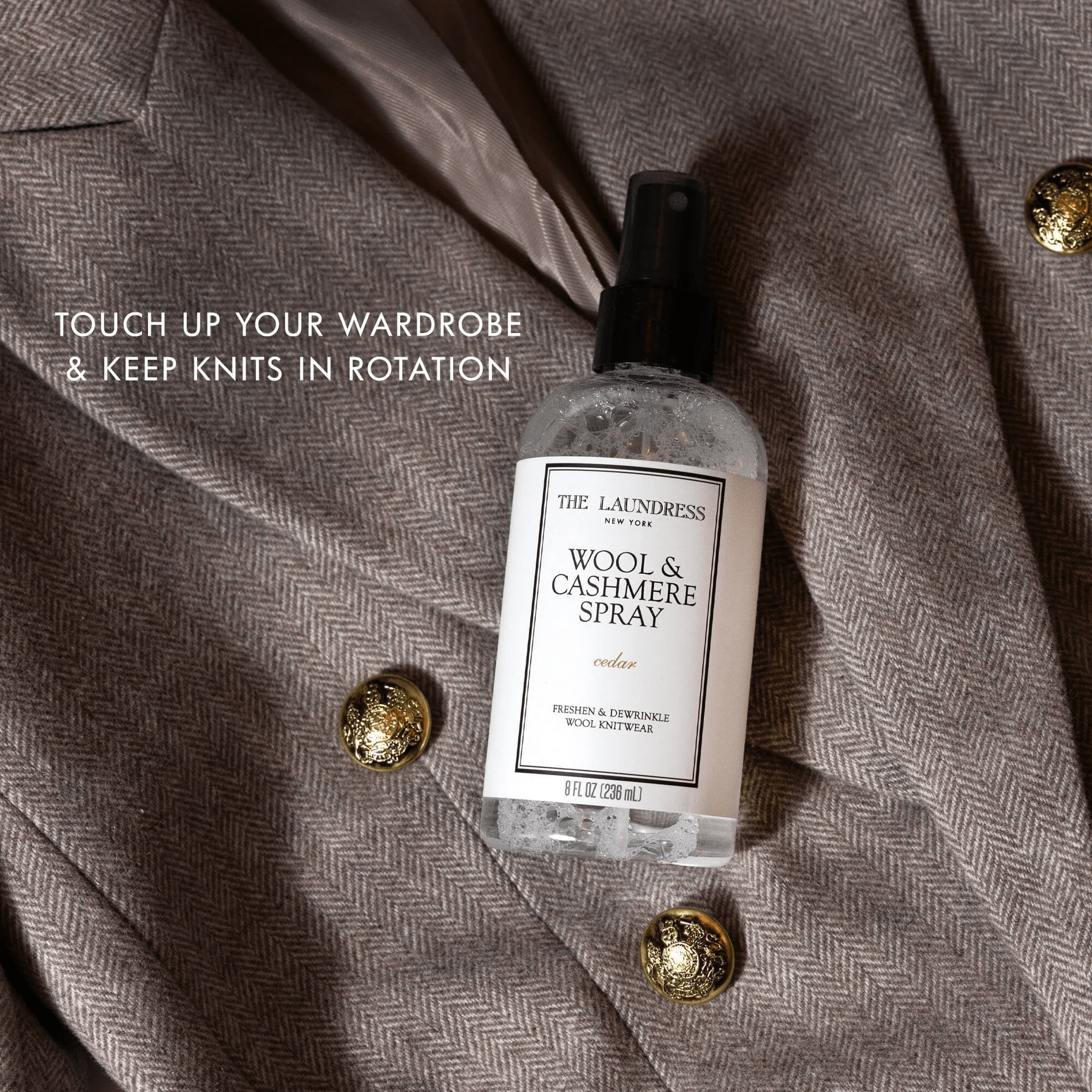 Why dry clean knits when you can take exceptional care of them at home with The Laundress Wool & Cashmere Spray? Made to treat knits like heirlooms, this formula freshens and adds a perfumer-crafted cedar scent to knitwear between washes. Mist this fabric spray formula to freshen wool, cashmere, merino, mohair, and blends. To dewrinkle woolens, simply spritz, and gently pat and smooth knitwear. If you loved our previous Wool & Cashmere Spray and Crease Release formulas, you'll delight in this new all in one finishing spray to complete your fine fabric care routine.