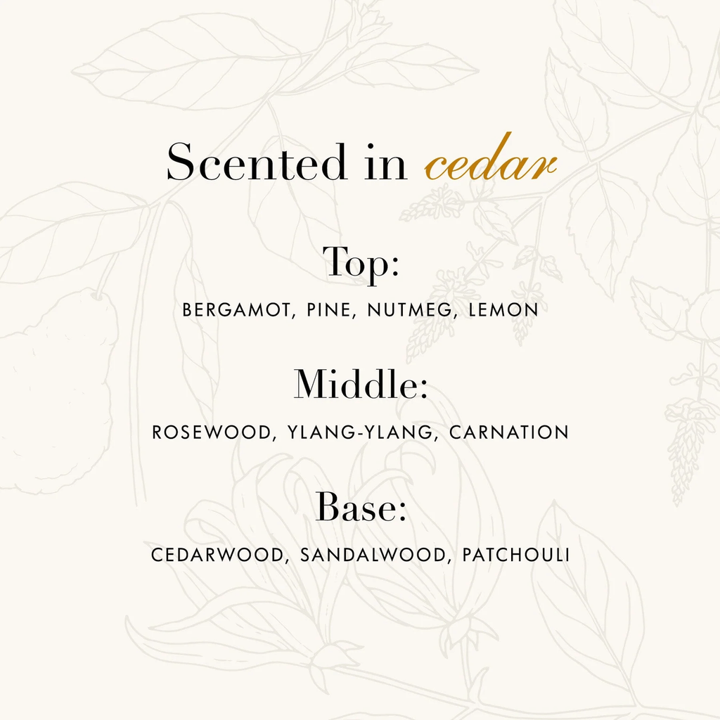 • Scented in Cedar, featuring soft, elegant notes of bergamot, rosewood, and sandalwood