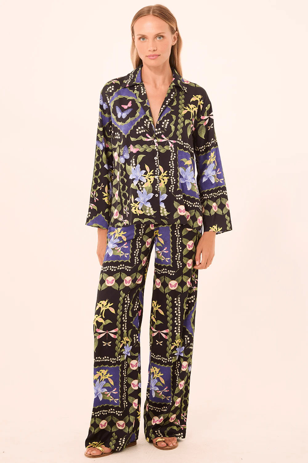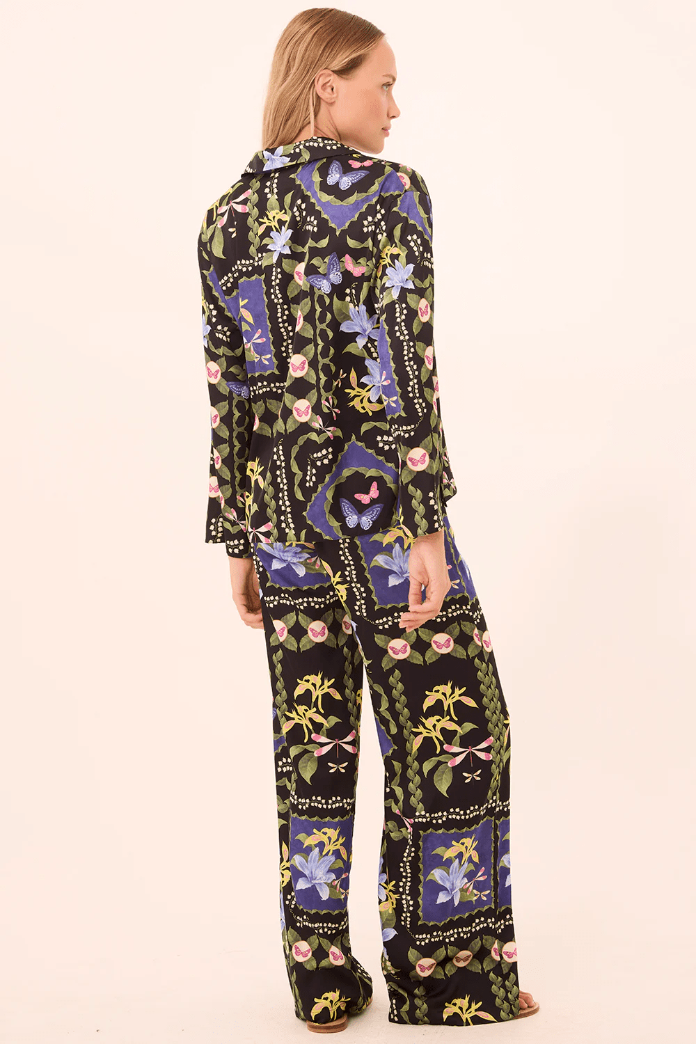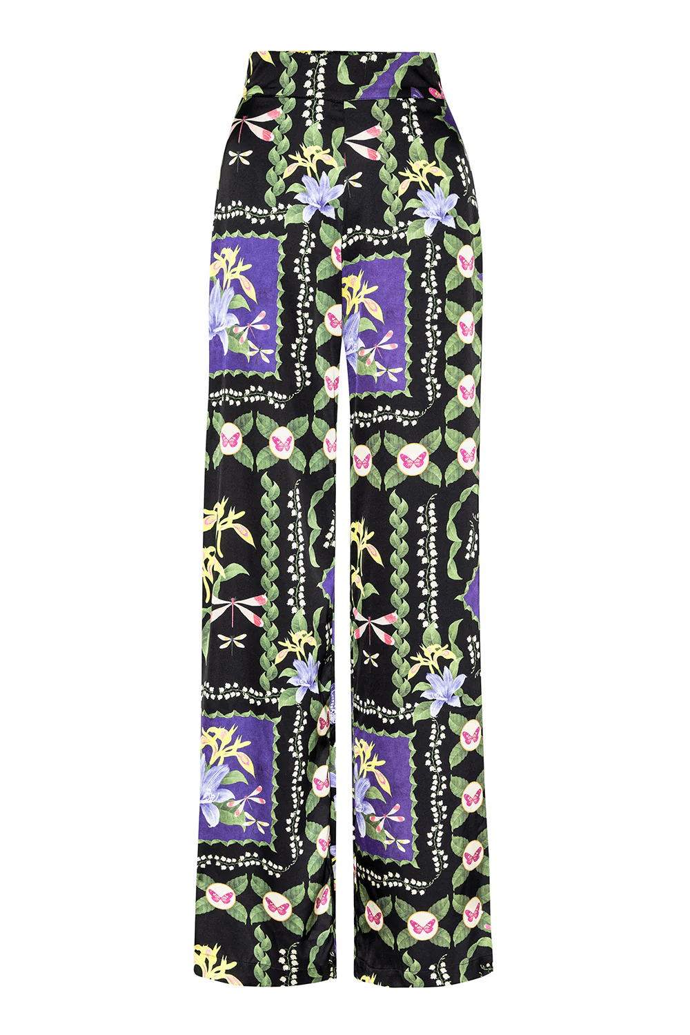 Izzie is a wide-leg pant cut from our gorgeous patchwork butterfly satin. Designed in a pull-on style with a flat front waistband and elasticated back for comfort, it features side slit pockets for a relaxed yet refined finish. For a statement look, pair with the coordinating Isme top.