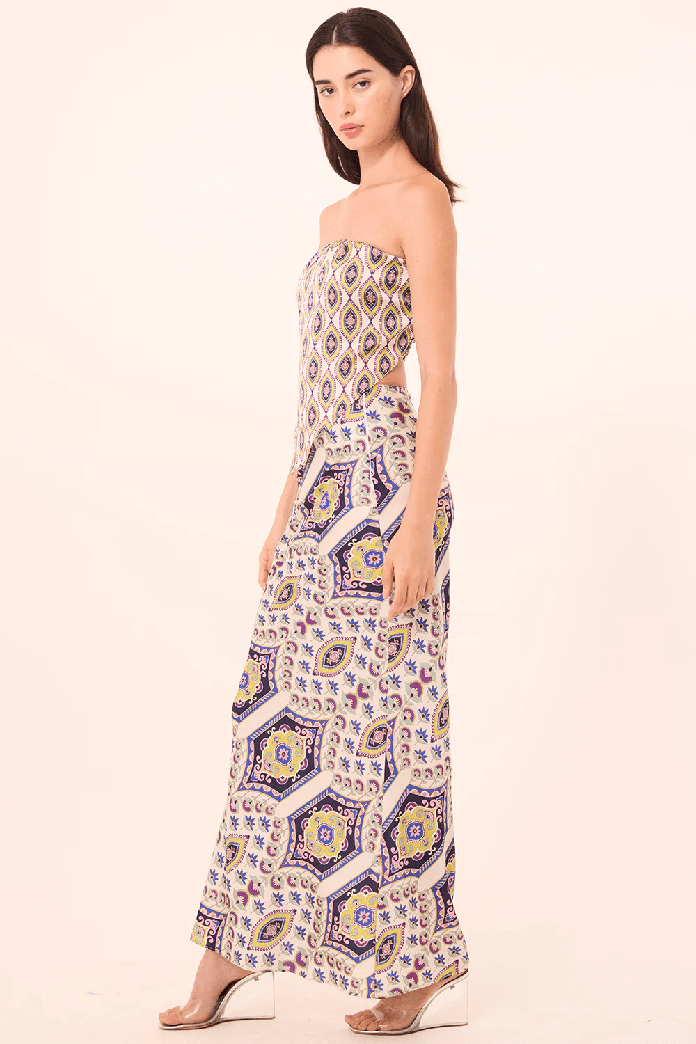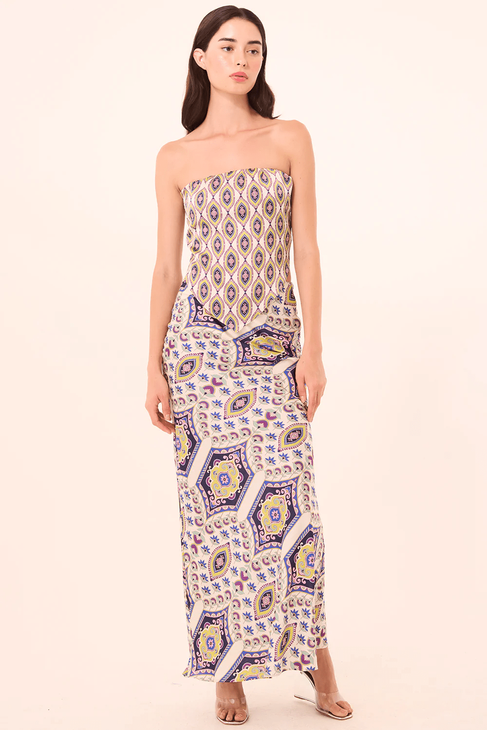 Our best-selling Sierra skirt is a maxi A-line silhouette cut on the bias for a fluid, flattering drape. Designed with a gathered waist and hidden side zip closure, it’s crafted from a gorgeous mosaic eye printed satin. Pair with the coordinating Mae top for a standout set.