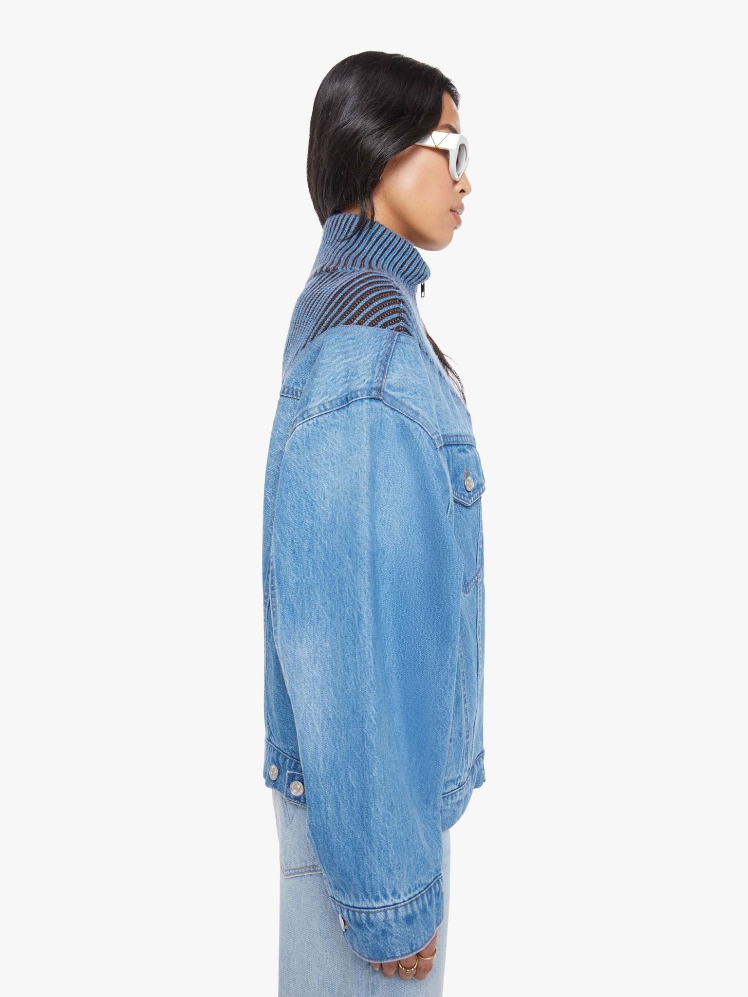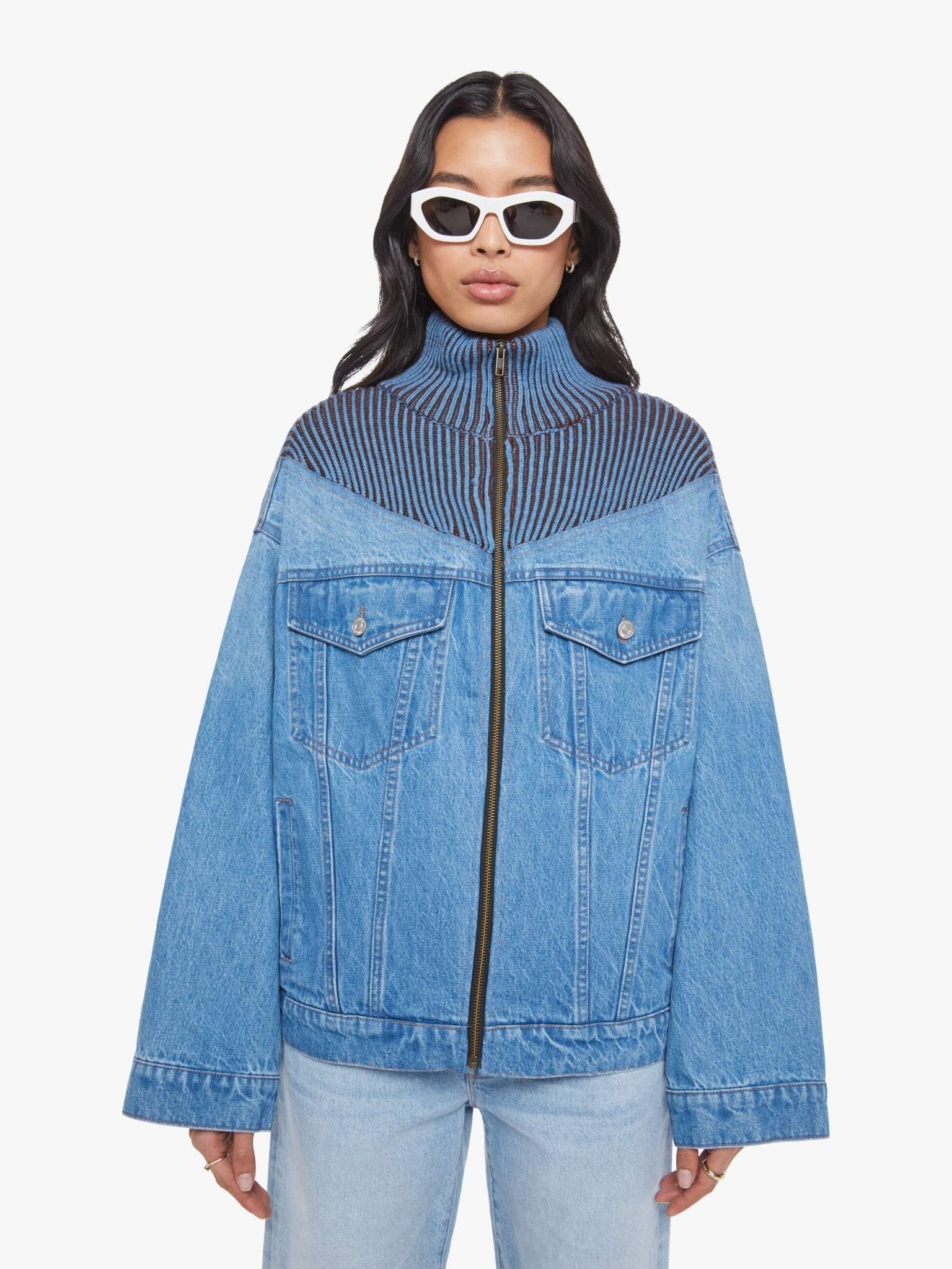 Serve chilled. Half denim jacket, half sweater, the Mixtape is designed with ribbed details around the neck, chest and shoulders, a high collar, drop shoulders, extra-wide long sleeves, front patch pockets and a super boxy fit. Made from rigid 100% cotton, Coldslaw is a faded denim with blue and brown knit fabric around the neck.