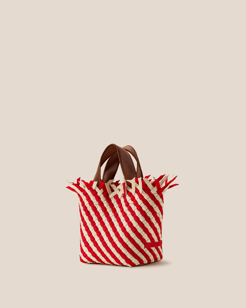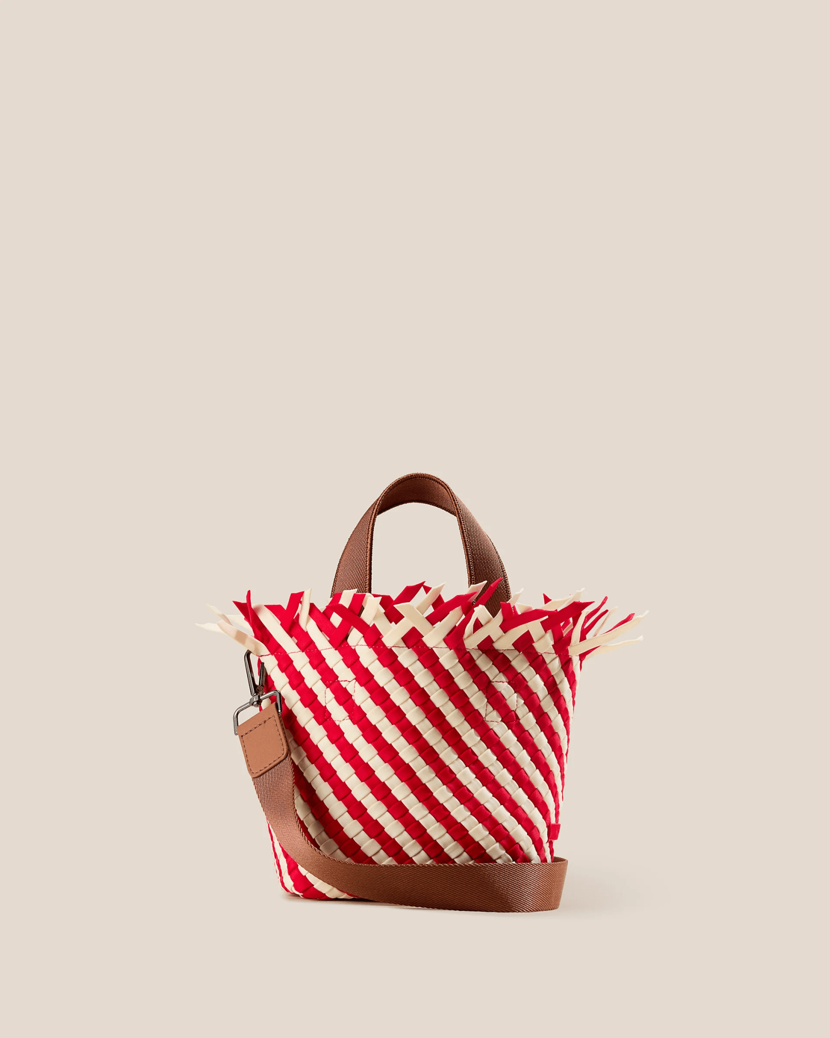 Handwoven neoprene in Red and Bone with textural fringe finishing and nylon handles. The Havana Petit Tote is a fresh take on our classic silhouette, carrying all your essentials comfortably.