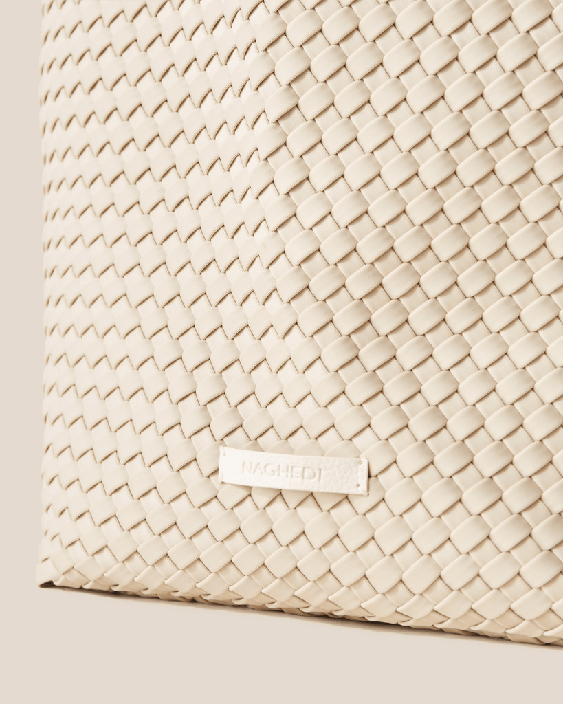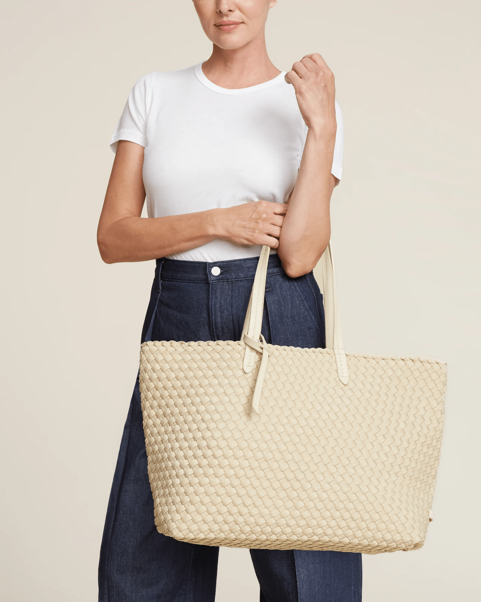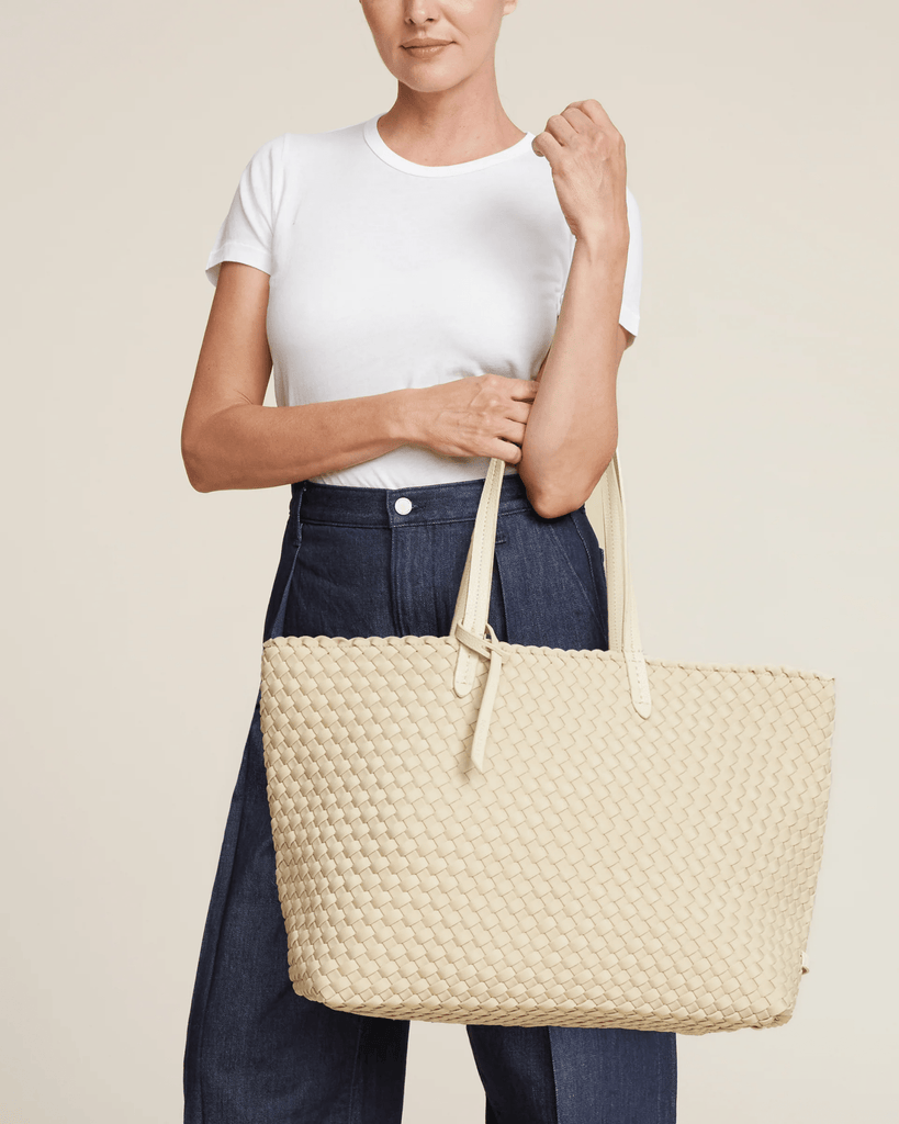 Handwoven neoprene in cream Designed for travel, the Jetsetter Large Tote can also be carried for work and baby.