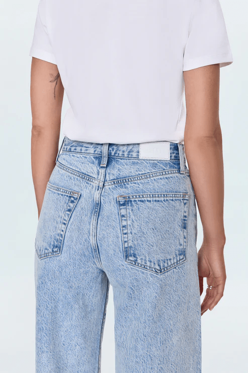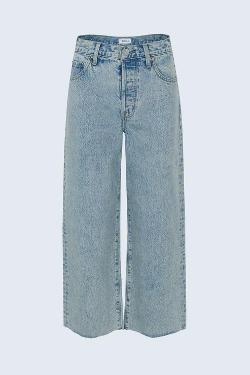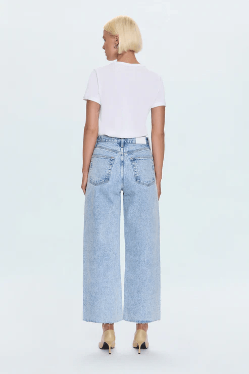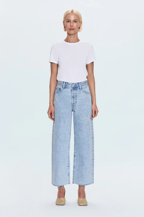 A modern take on a signature shape, Tate Crop sits high at the waist with a bowed wide leg and cropped 28" inseam, striking the balance between structure and ease. The curved leg adds soft dimension, while the wide cropped opening makes it endlessly versatile for pairing with boots or flats. Crafted from rigid non-stretch denim in Modena, a fresh light wash that channels effortless vintage cool.