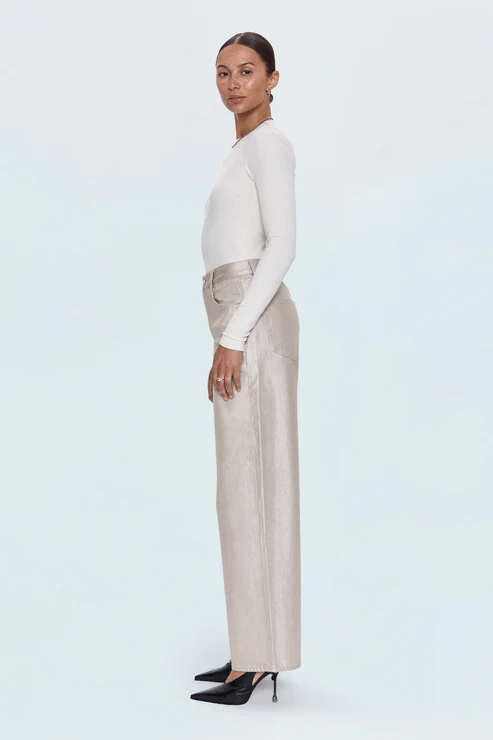 A signature shape, Tate features a high rise, bowed wide leg, and full-length 32" inseam that creates elegant movement and modern proportion. Crafted from 100% cotton non-stretch denim in Champagne Luster, a pearly coated finish that reflects light with every step for an effortlessly elevated look.