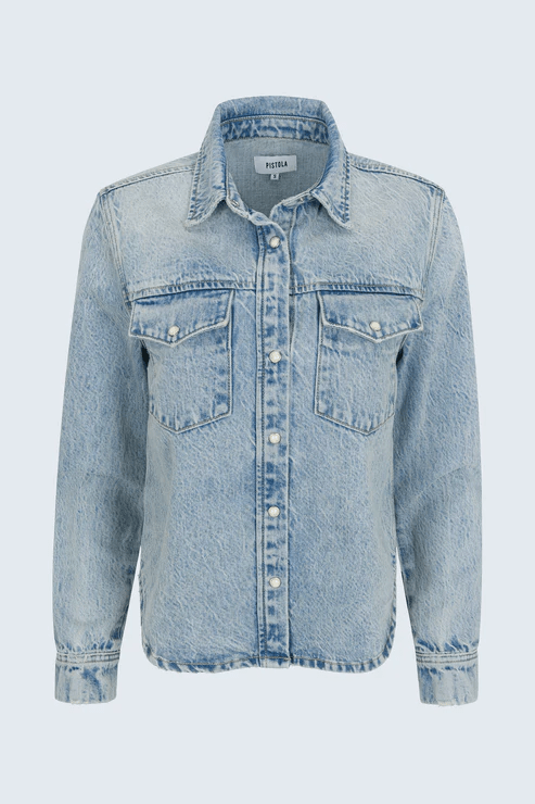 Tailored and timeless, Thea refines the denim shirt with a shrunken, modern silhouette that flatters without feeling fitted. Classic details—button front, pointed collar, and chest pocket—ground it in tradition, while the proportions make it ideal for layering under jackets or over tanks. Crafted from 100% cotton non-stretch denim in Modena Vintage, a sun-faded light blue wash that channels authentic, lived-in character.