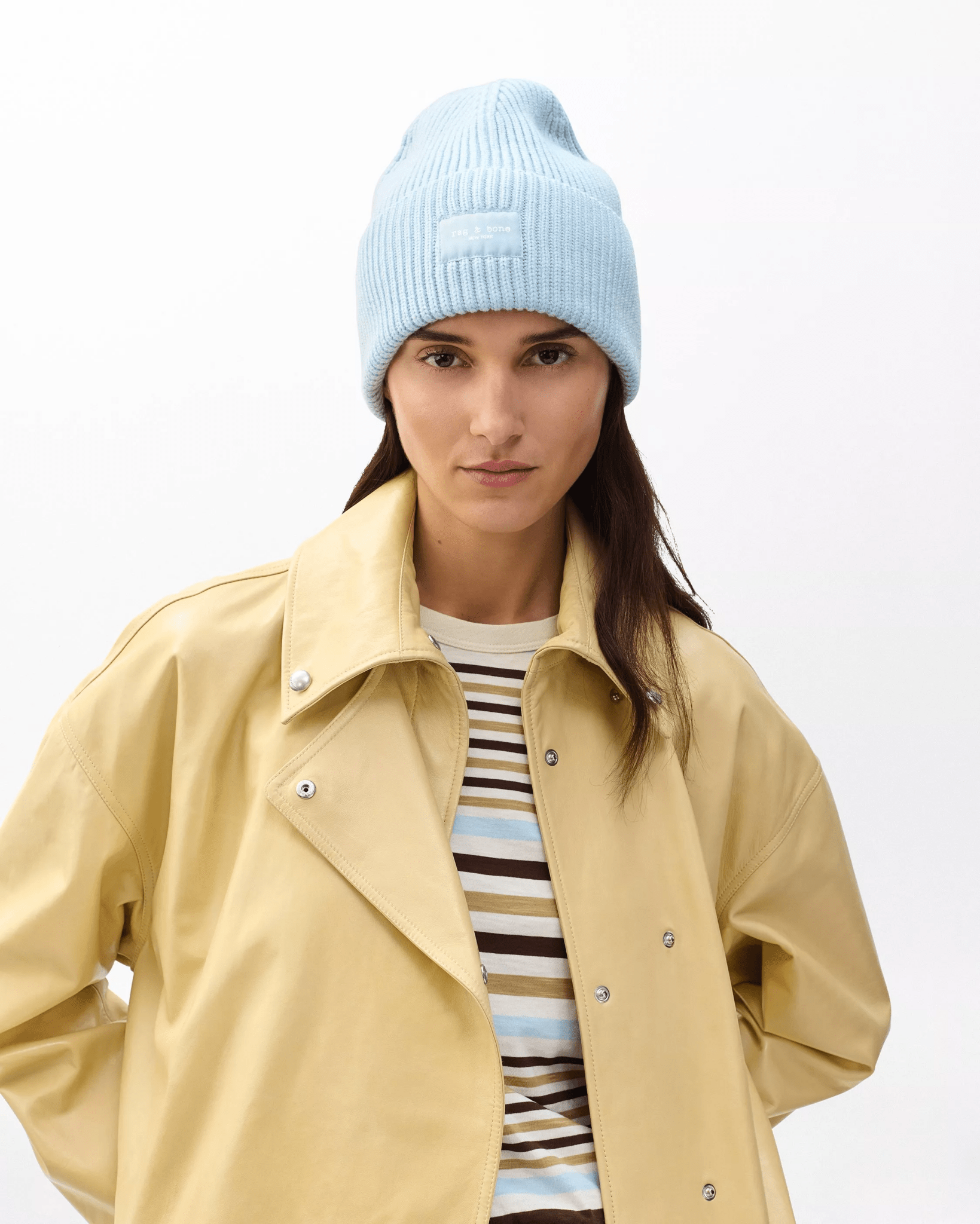A cold-weather staple. Knit from a soft, extra-fine merino wool blend, this beanie hat is designed for a snug fit with a folded brim featuring a logo patch at the center.