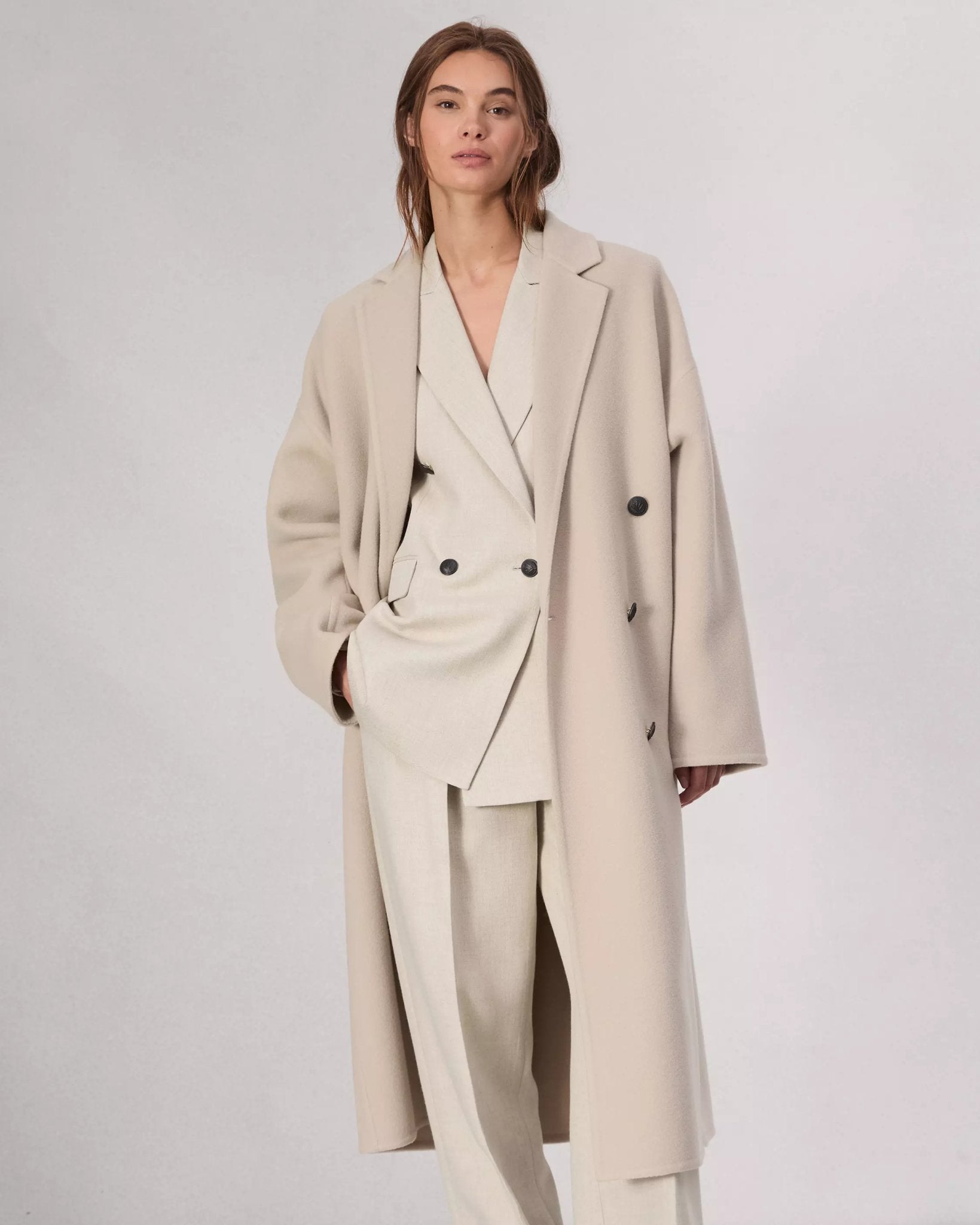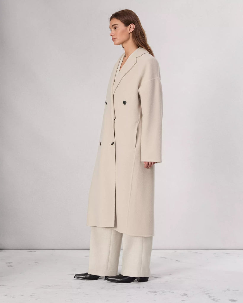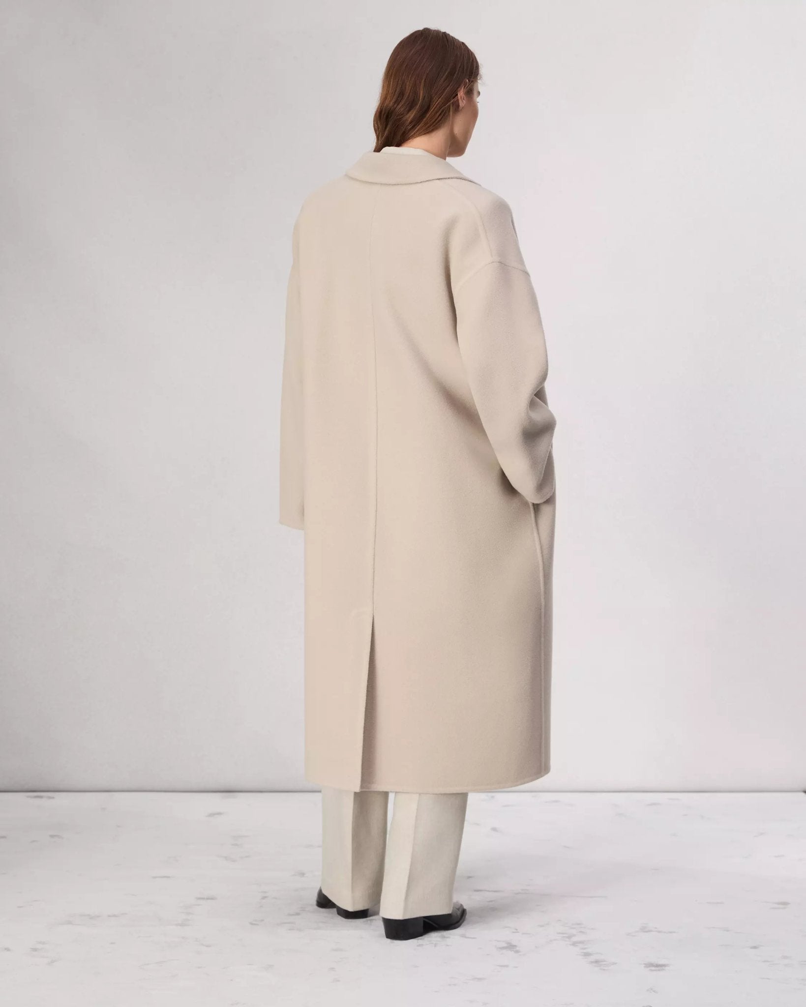 The Thea. Our longline coat is cut with a relaxed silhouette with substantial notched lapels in an Italian double-faced wool-blend.
