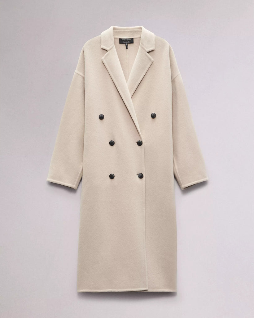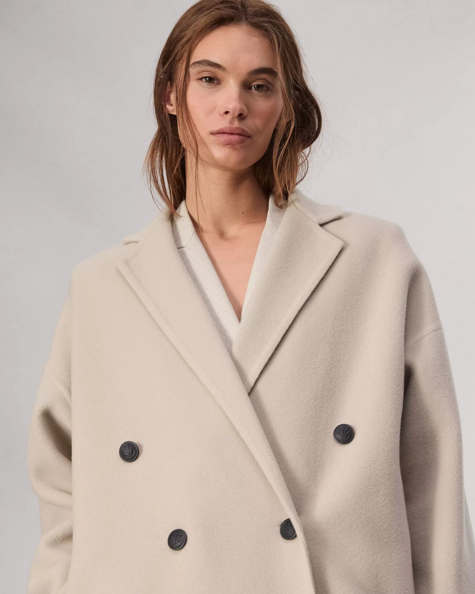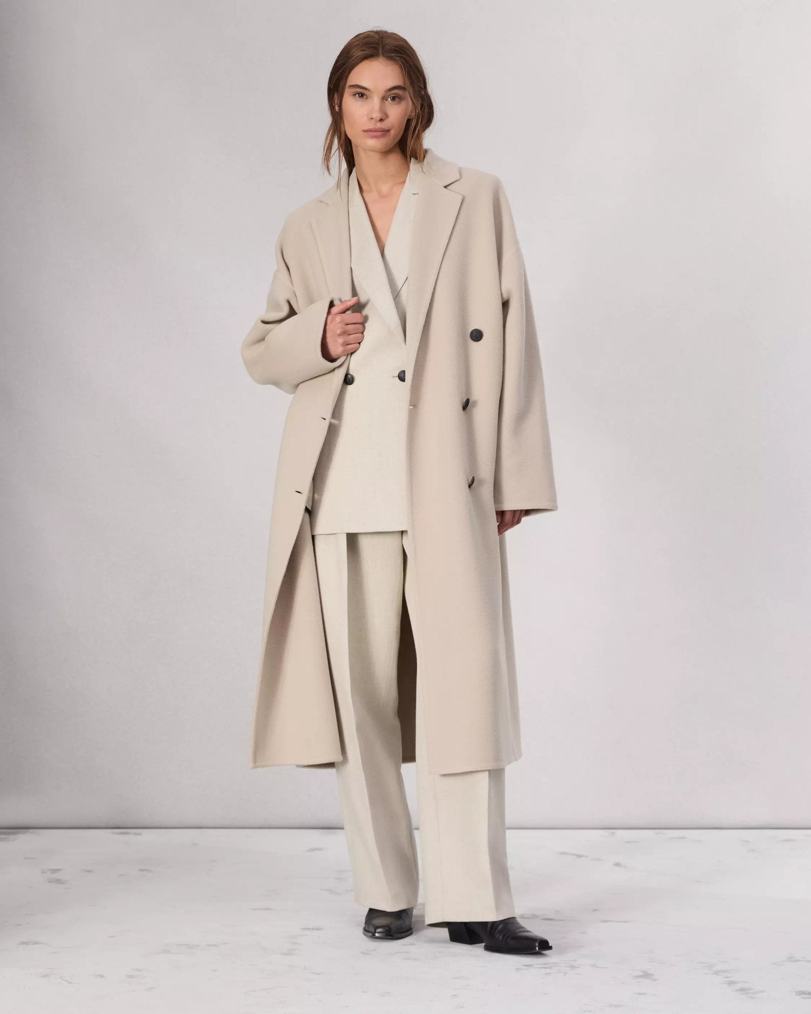 The Thea. Our longline coat is cut with a relaxed silhouette with substantial notched lapels in an Italian double-faced wool-blend.
