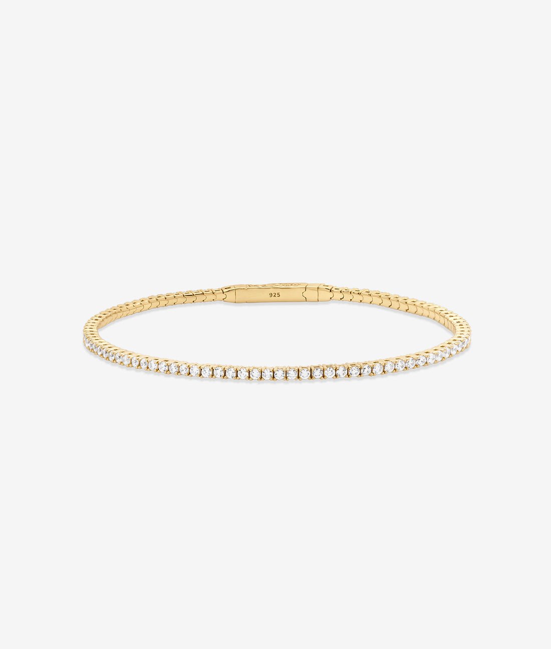 A refined update to the classic tennis silhouette. The Bianca Bangle Bracelet features a seamless line of handset stones along a structured, flexible gold vermeil band. Designed to hug the wrist with quiet precision, it blends softness with structure—perfect for stacking or wearing solo.
