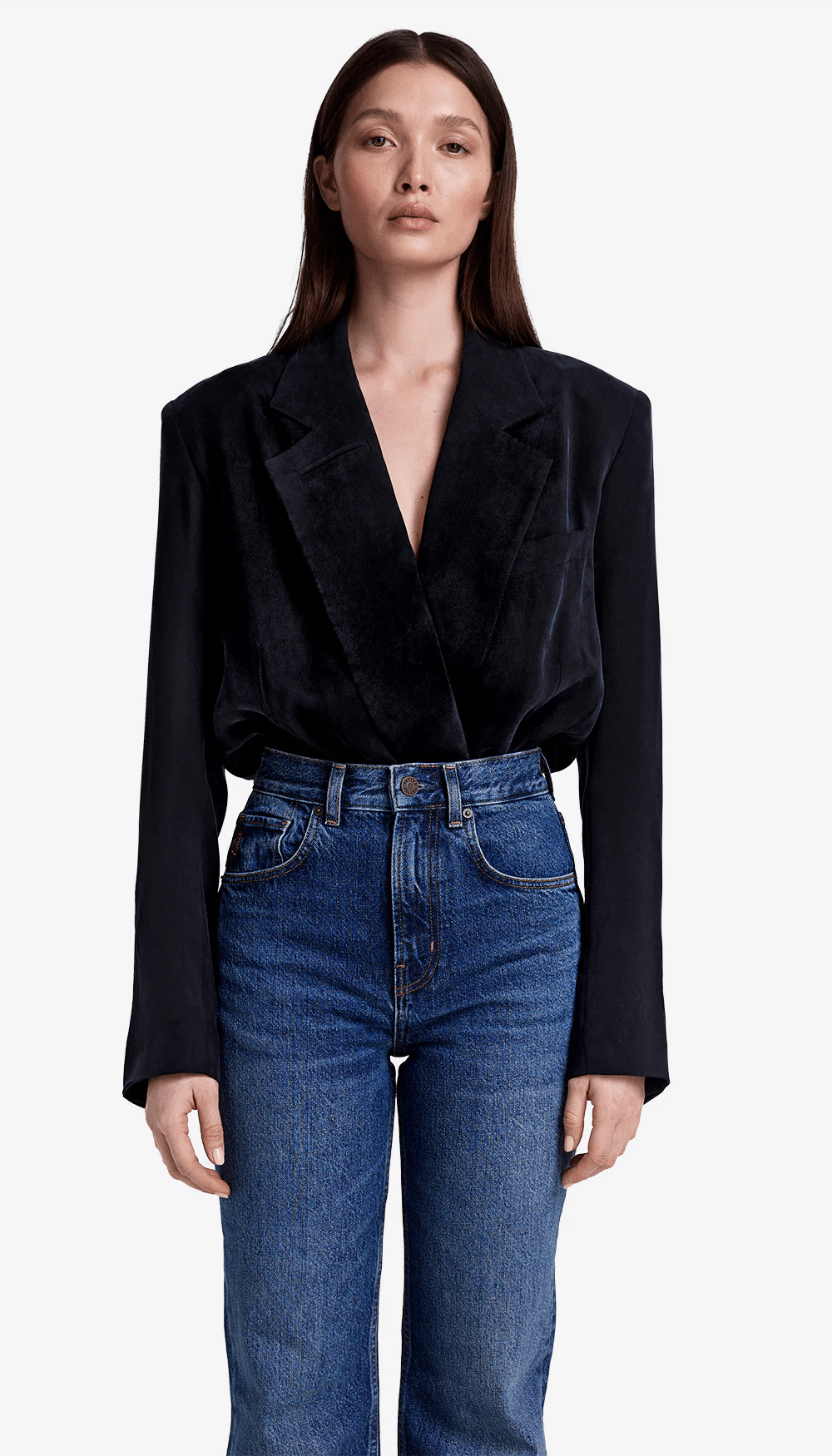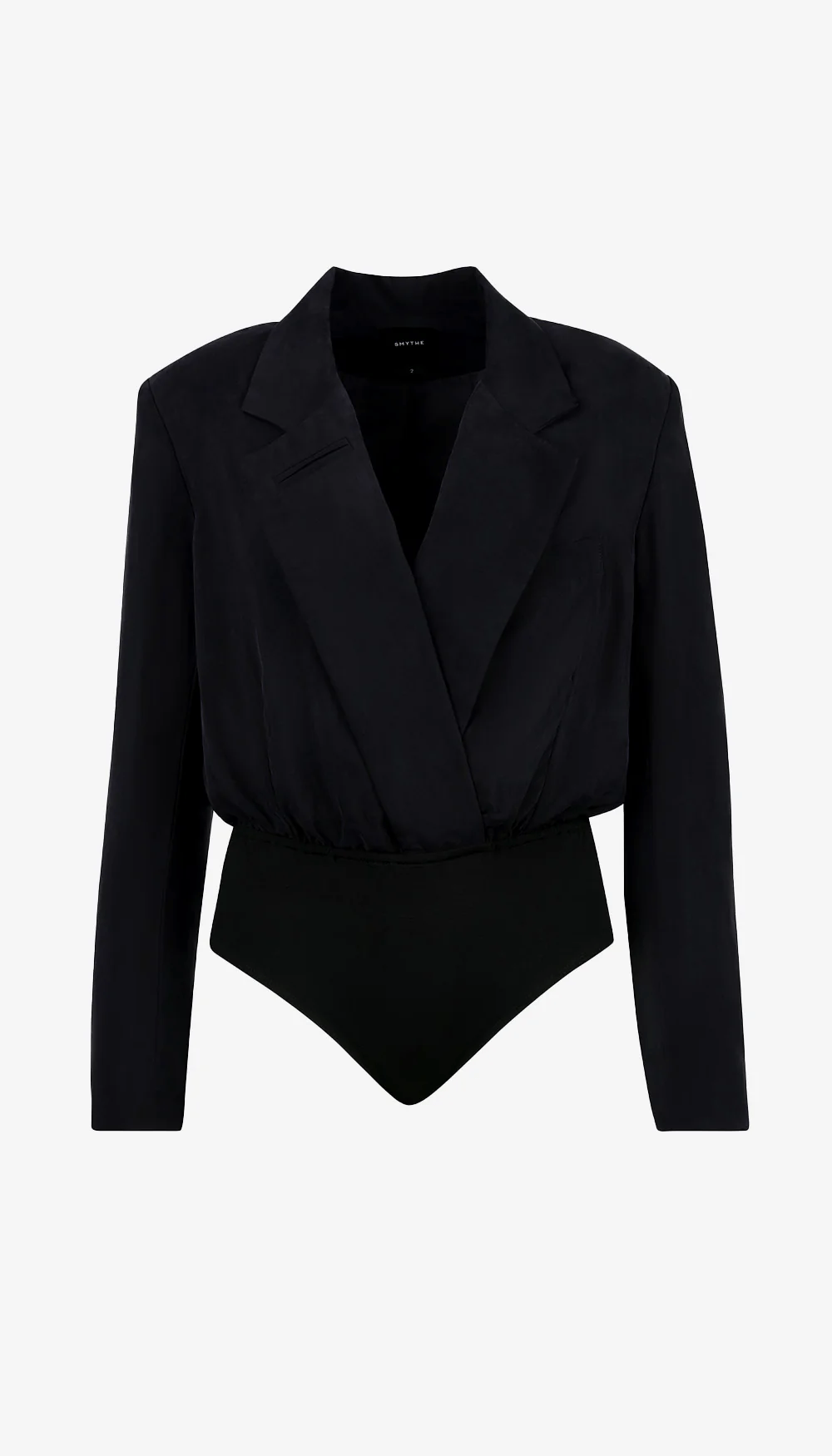 Details: A relaxed silhouette, this new blazer bodysuit features a strong shoulder, wide lapel with an exaggerated welt detail and a thong-cut bottom. This garment fits true to size, take your usual size.