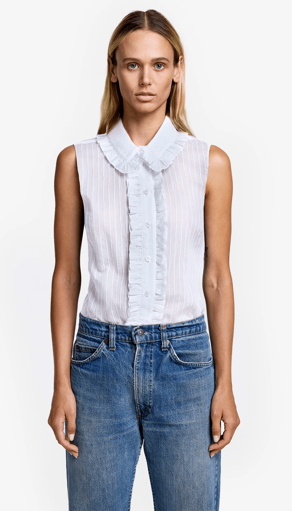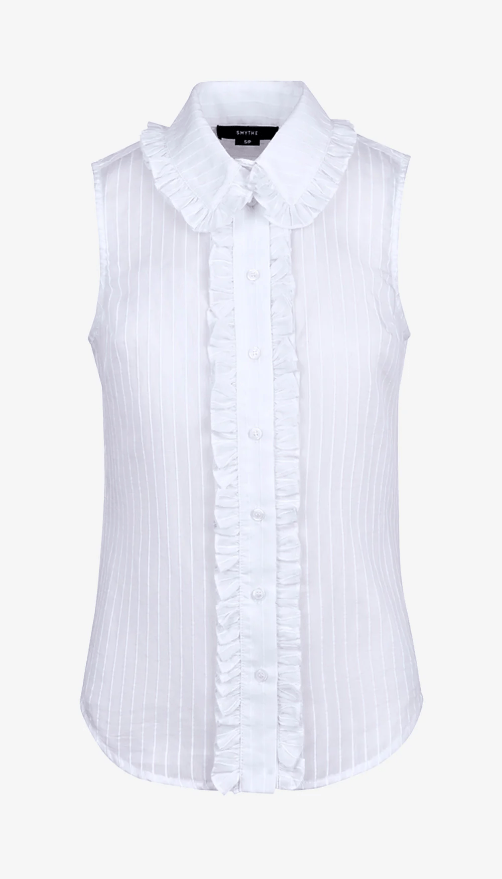 Details: Moderately tailored, this sleeveless shirt features a ruffle trim at the collar and front placket. This garment fits true to size, take your usual size.
