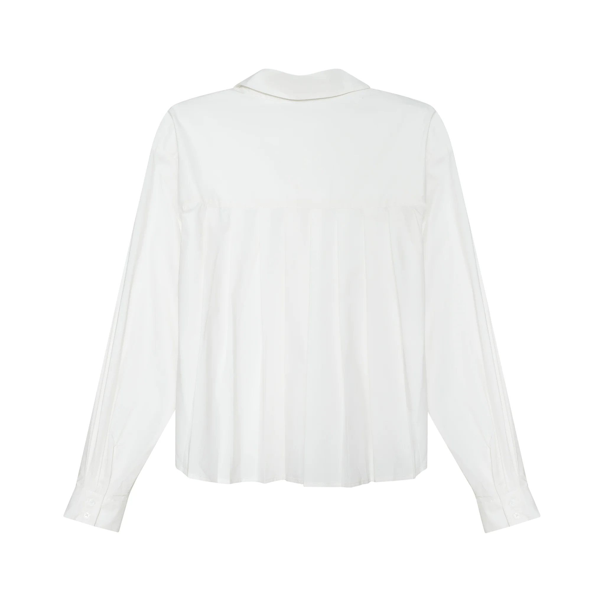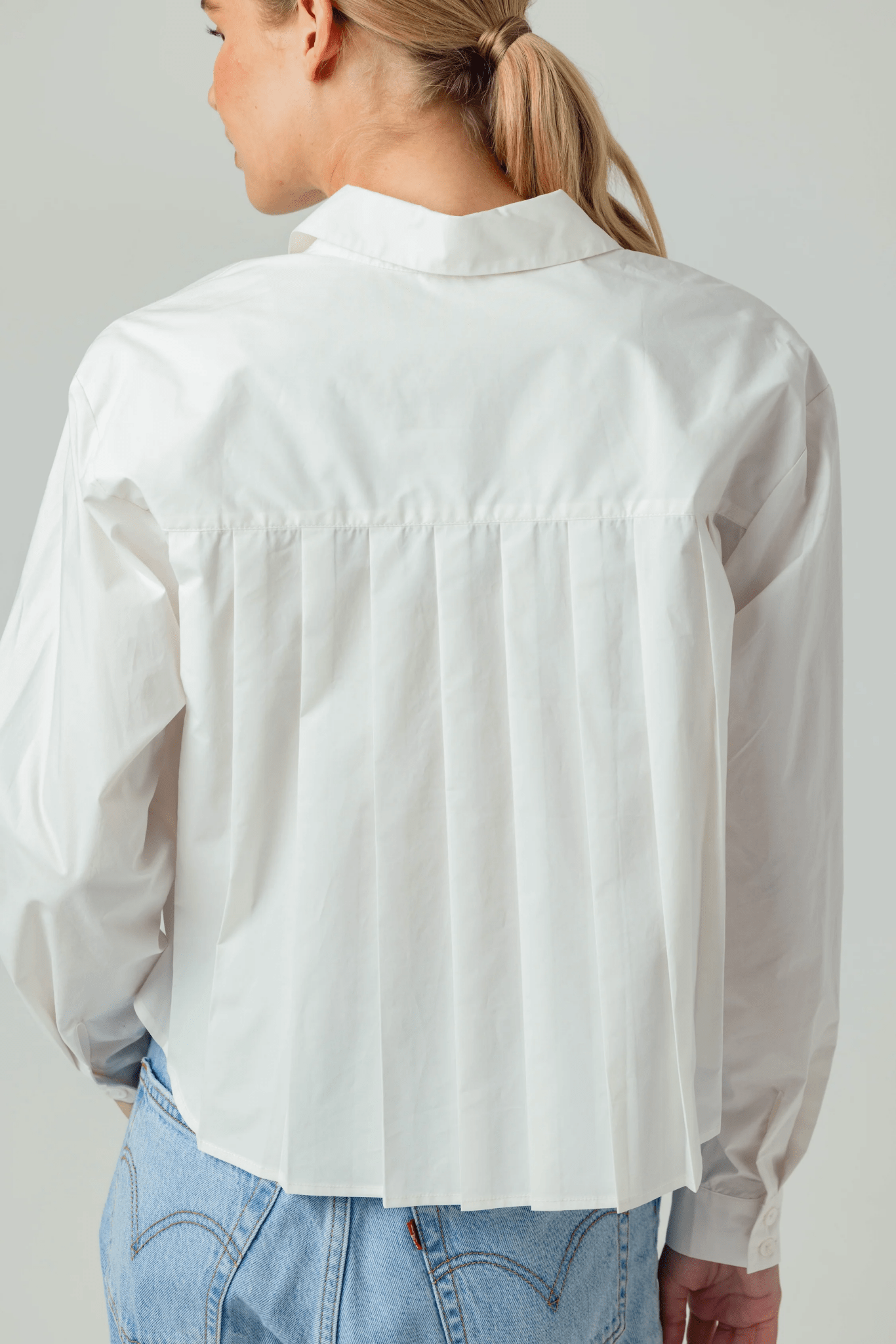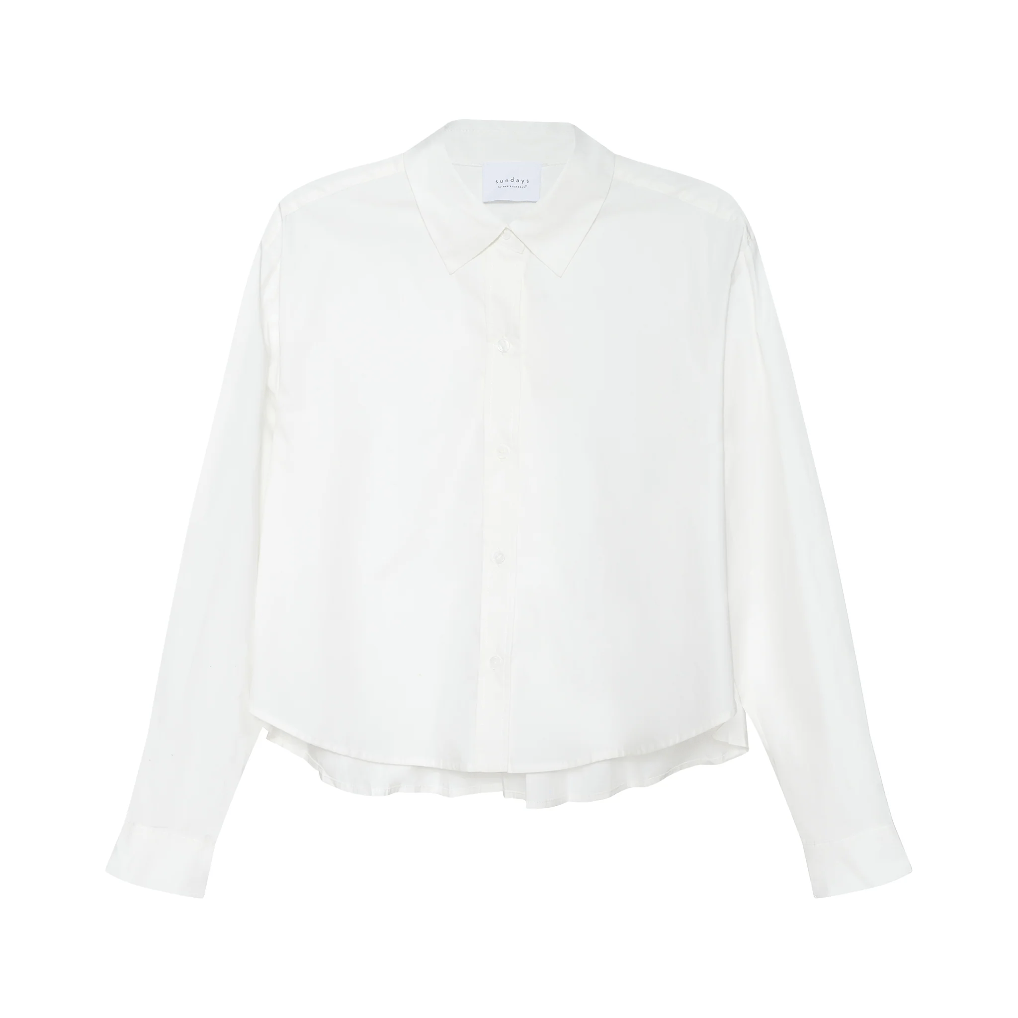 The Freja reimagines the classic button-up with playful design details in true Sundays style. Cut in our signature poplin, it features a traditional button front, rounded hem, and soft back pleats that add movement and ease. Fit is slightly oversized for a cool easy feel.
