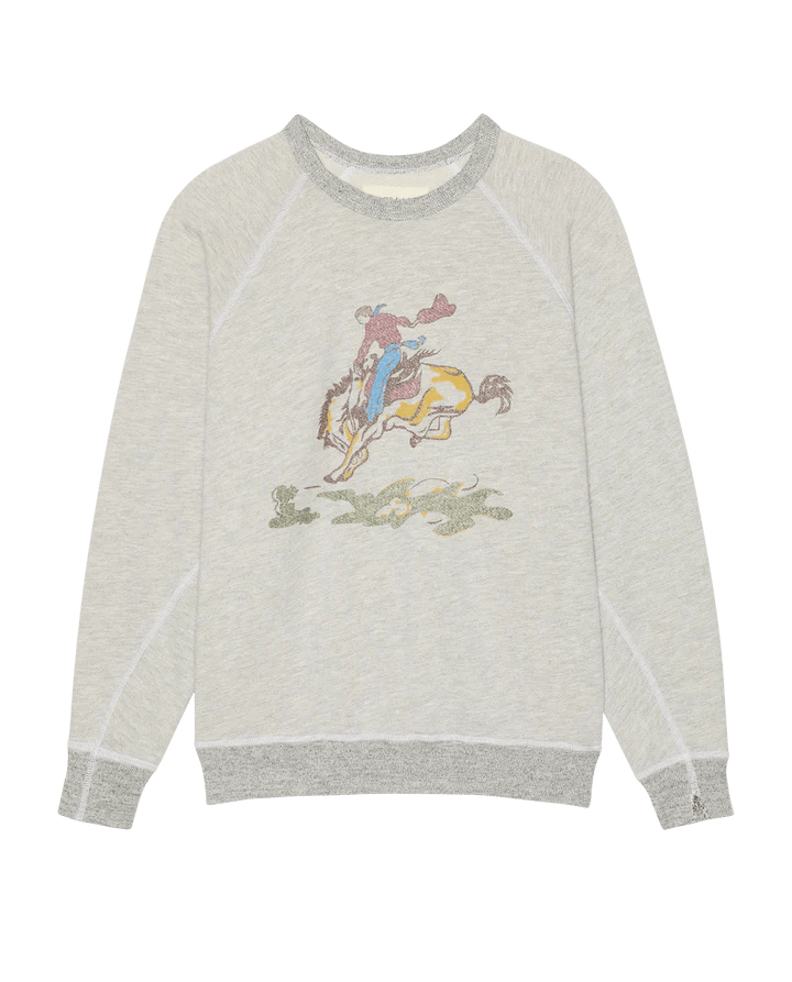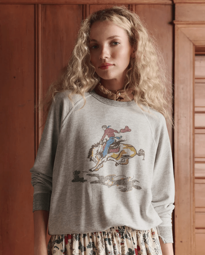 This classic is based on our favorite vintage sweatshirt body and features a lived-in vintage wash and our signature slit on the left cuff. Made from a washed terry with a vintage feel, this oversized sweatshirt also features the softest hand. This season, it features The Rider Graphic- inspired by a 1950s little boy's graphic tee. We love pairing a sweatshirt back to tomboy-style staples as well as ironically styled with feminine skirts or a floaty dress. Handcrafted locally in Los Angeles, our process ensures beauty and uniqueness—no two pieces are alike.