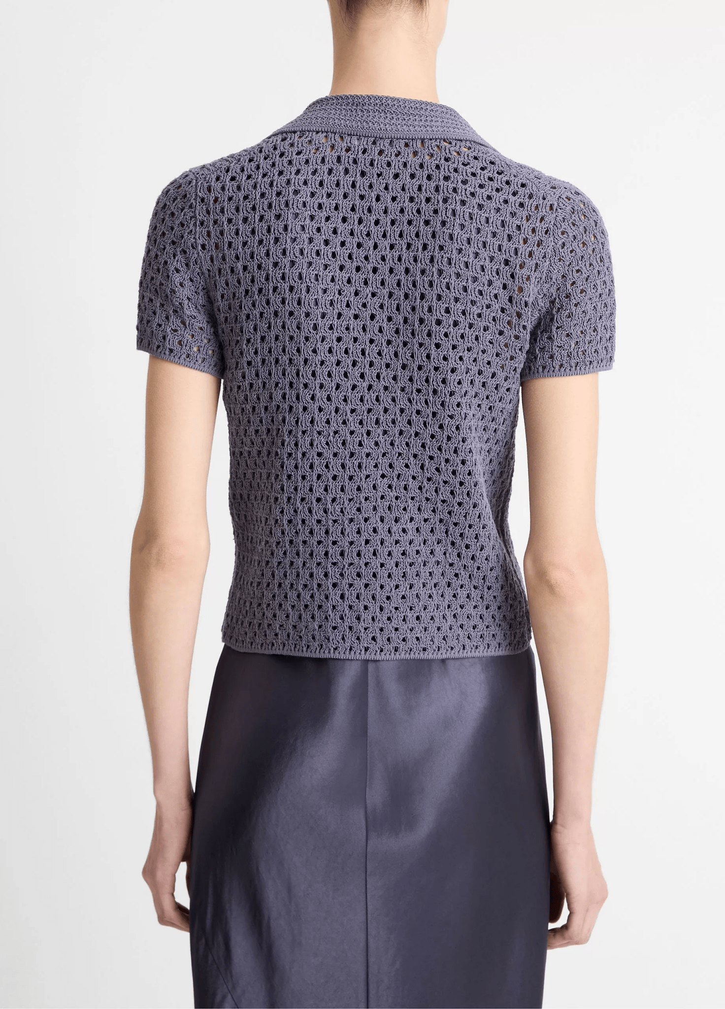 We've knit this Italian cotton polo sweater in an open macramé stitch for a striking textural finish and lightweight, airy feel into warmer days ahead.