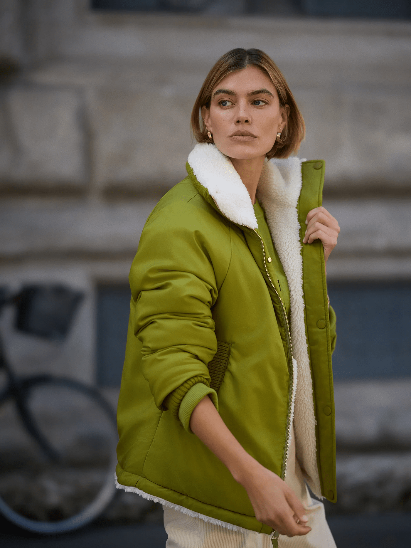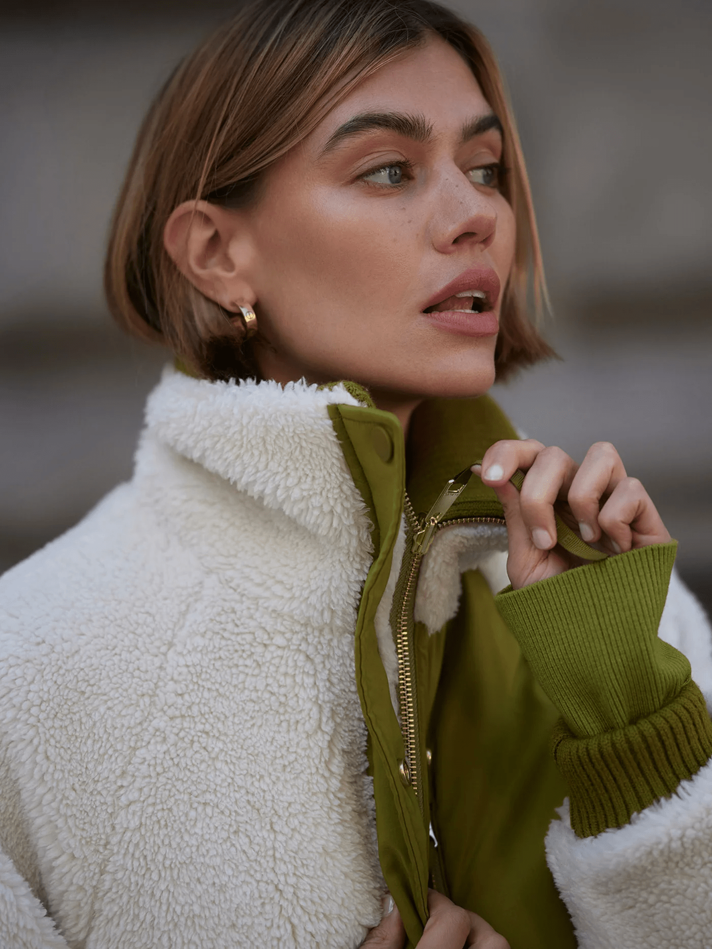 The Glover is a modern reversible jacket with Sherpa on one side and Soft Touch Twill on the other, perfect to keep you warm in the cold. Accentuated with contrast colors and textures on both sides, the design is complete with a snap- and zip-fastening and an exposed chest pocket.